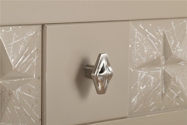 抽屉拉手材质为锌合金,耐磨耐腐蚀性较好亮度高,与星光效果的抽屉相辅相成;立体突出的星光造型,与抽屉的星光阴刻遥相呼应,让家具更形象生动,熠熠生辉。