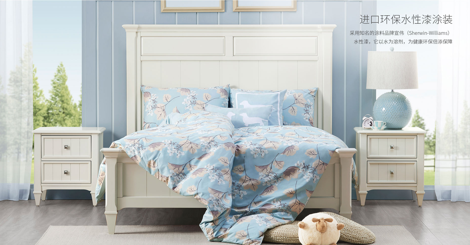 恣在家坚持为消费者带来更安全环保的家居产品, 率先在行业内采用成本更高的水性涂料, 携手涂料厂商Sherwin-Williams,花费3年时间, 攻克了水性漆在美式涂装的表现力及生产工艺的行业难题, 为您提供风格丰富、色彩多样、环保全水性涂装产品。