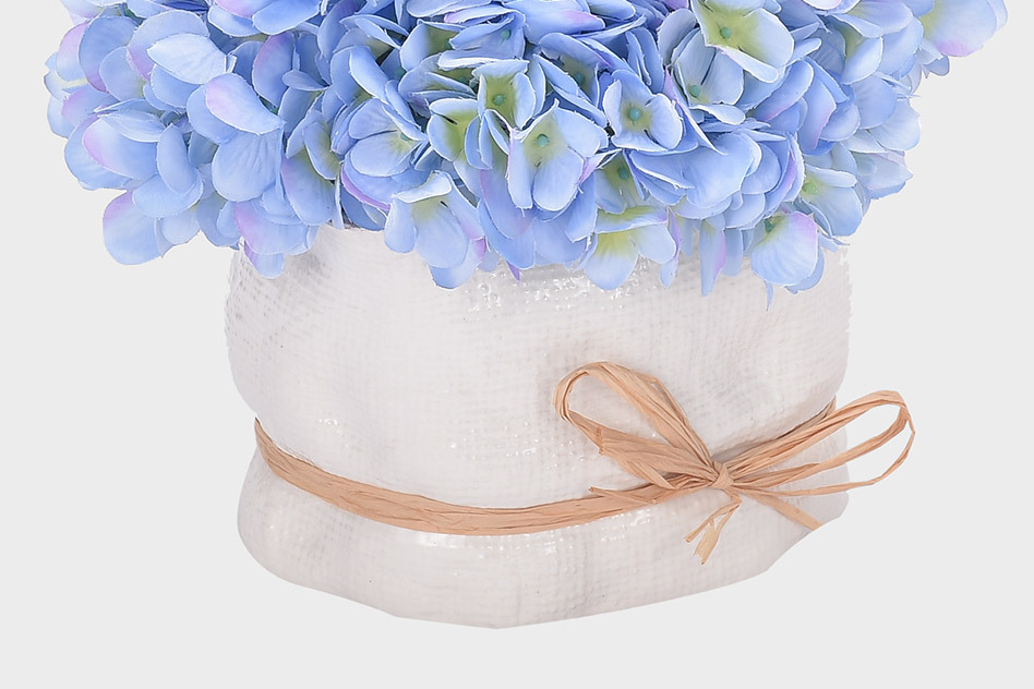 白色陶瓷花器,不规则形状,粉色草绳捆扎。自然形成的肌理质感,满满的田园风。